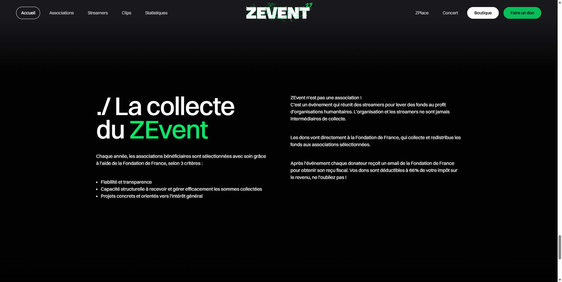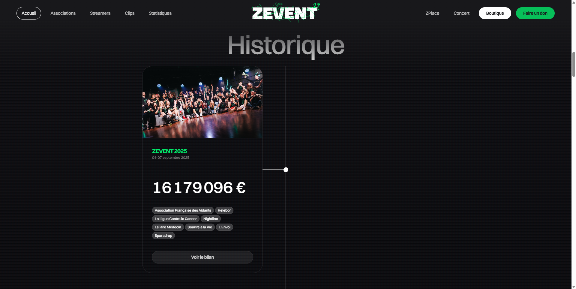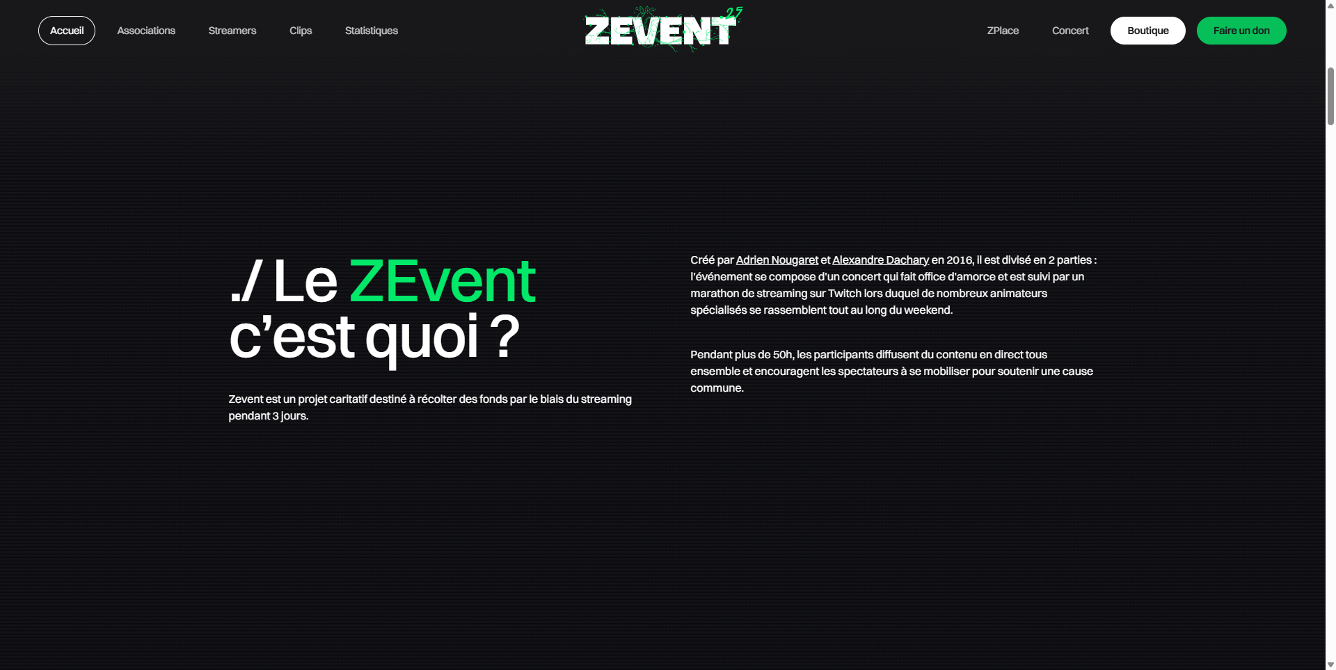 Voir le site webIntégration de la maquette de BastiUi qui à redesign le site du ZEVENT (Lien de la maquette : https://www.figma.com/community/file/1559521225721548044)